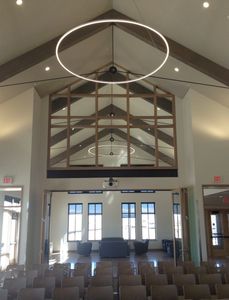 The lighting in the main fitness area was designed to follow the lines of the large wooden beams. Custom fixtures were designed with Axis Lighting with higher lumen outputs so we could provide the light on the fitness floor using only the main beams which were spaced about 50' apart and 30' above the fitness floor. Standoffs were designed so the uplight would miss the fire suppression lines and instead highlight the beautiful wood structure. Curved track was used on the curved beams to highlight the artwork that was integrated into the design early on in the design process ensuring the integrated with the architecture.